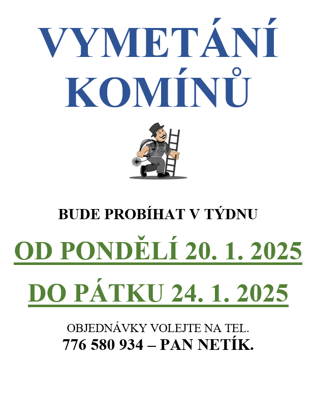 Kominík Netík bude ve Stárkově v termínu 20. – 24.1.2025. V případě zájmu volejte objednávky na tel. 776 580 934.